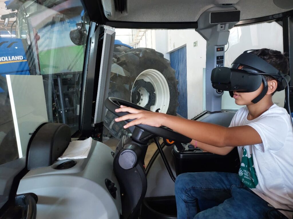Na instalação, os estudantes divididos em duas turmas conheceram o funcionamento de um pivô central, foram acompanhados de um profissional para conhecerem as cabines de tratores e pulverizadores, e simularam a operação de uma máquina agrícola, em um simulador de pulverização disponível no CT.