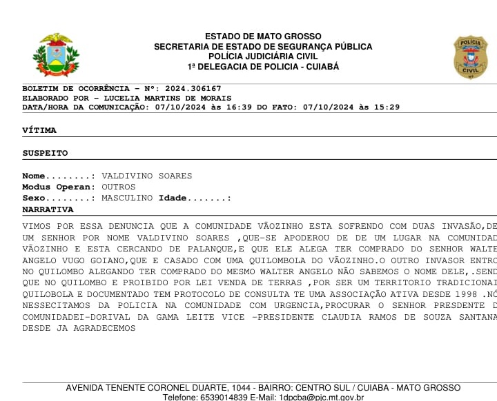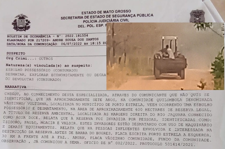 A denúncia foi formalizada em setembro desse ano junto ao Ministério Público Federal e à Superintendência Regional do Instituto Nacional de Colonização e Reforma Agrária (INCRA-MT) pela Associação Quilombola de Produtores Rurais da Comunidade Vãozinho/Voltinha de Porto Estrela. Um boletim de ocorrência também foi registrado na Polícia Judiciária Civil na mesma época.