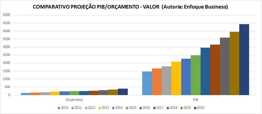 Esta projeção, elaborada pelo Enfoque Business, tem como base os dados históricos do PIB aferidos pelo Instituto Brasileiro de Geografia e Estatística (IBGE) e os valores da Lei Orçamentária Anual (LOA) do município, abrangendo o período de 2010 até a LOA projetada para 2026 (Projeto de Lei 319/2025).