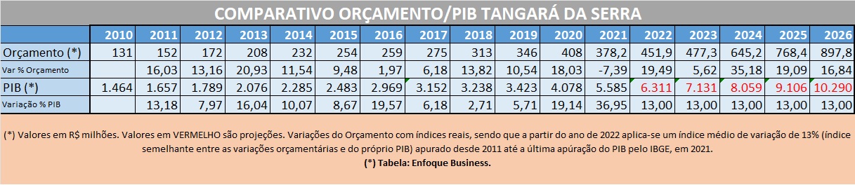 Dessa forma, como não há dados oficiais do IBGE após 2021, o Enfoque Business utilizou a média de crescimento orçamentário (13%) como base para projetar o PIB de 2022 a 2026. A semelhança nas linhas de tendência entre o orçamento e o PIB, evidenciada nas tabelas e gráficos, valida a metodologia para estimar que o PIB de Tangará da Serra superará R$ 10 bilhões em 2026.